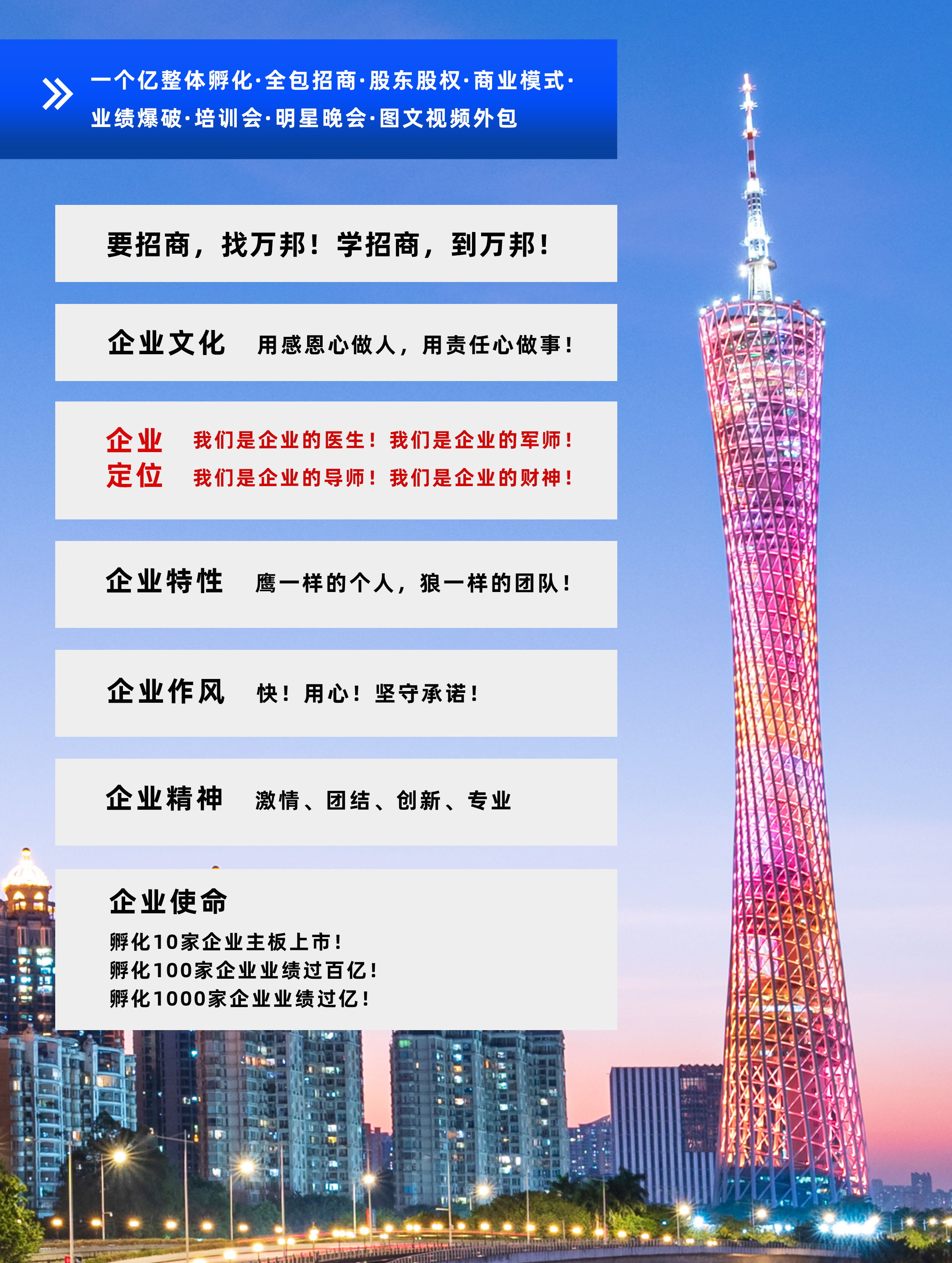 萬邦集團(tuán)成立于2003年6月,專注于為企業(yè)進(jìn)行招商和整體孵化,包含公司診斷、產(chǎn)品定位到量身打造商業(yè)模式系統(tǒng),再到投人、投錢、投資源,一起干的分紅股東招募,鐵血軍團(tuán)的打造,全國(guó)招商會(huì)議,為企業(yè)建立一套完善;成熟的招商系統(tǒng),教育系統(tǒng)、培訓(xùn)系統(tǒng)。
